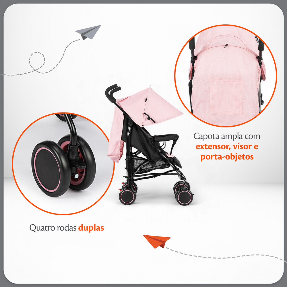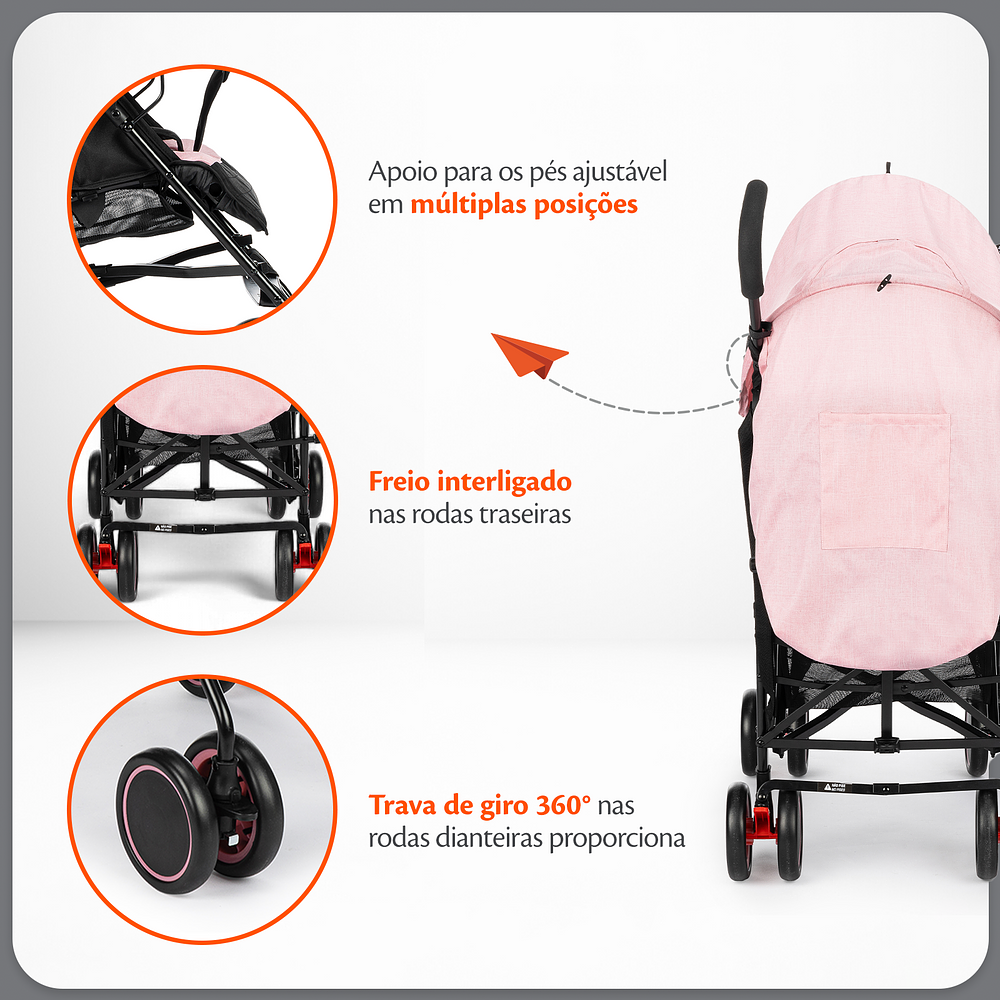 O Brasil é enorme, e cheio de possibilidades. Por isso, o carrinho Pipa foi pensado para abraçar as diferentes nuances de cada família e local de uso. A capota do carrinho possui visor e pode ser estendida, ficando ainda mais ampla para proteger seu bebê nos dias ensolarados e também do vento. O carrinho tem rodas duplas, com controle de giro nas dianteiras e freio interligado nas rodas traseiras, o que ajuda o carrinho a se movimentar com tranquilidade em qualquer tipo de passeio. Além disso tudo, o carrinho Pipa conta com um cesto porta-objetos: dá para levar a bolsa, os brinquedos, várias coisas que ajudam no dia a dia.