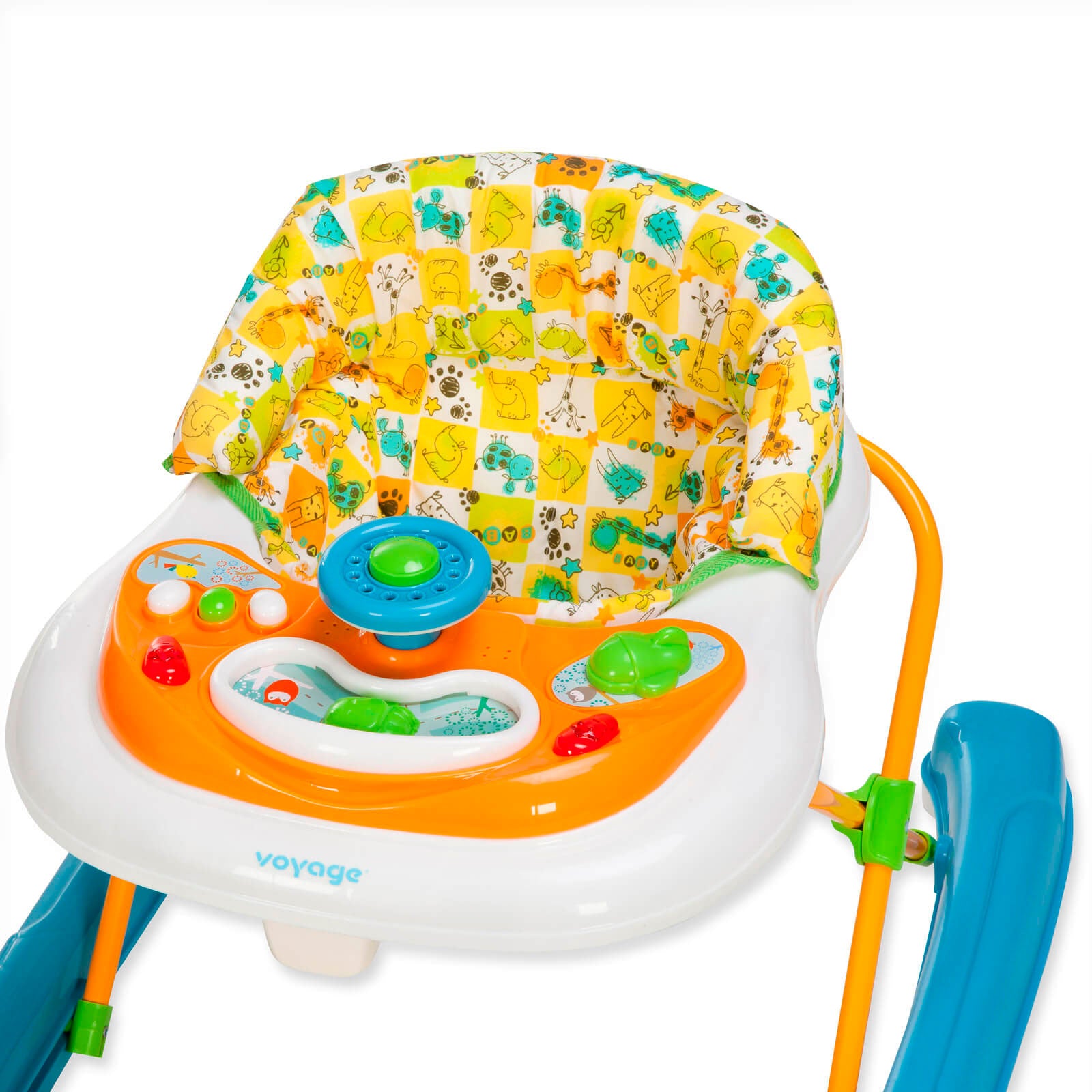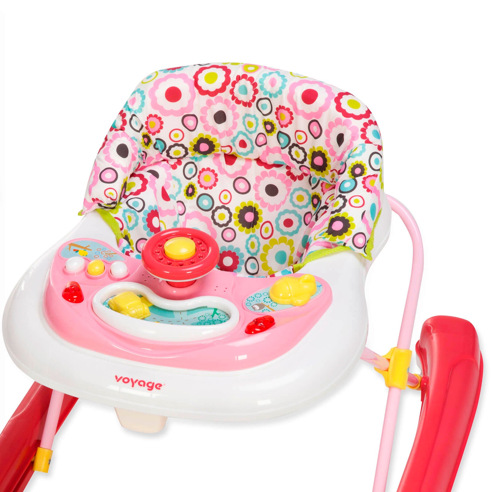 Possui 3 posições de altura para as várias fases do bebê, bandeja musical removível com brinquedos interativos e assento impermeável com encosto removível e lavável.
