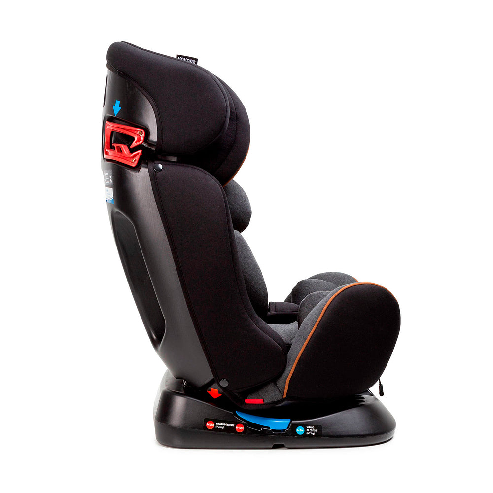 Tecido macio e muito acolchoada. Com 3 posições de inclinação sendo uma posição super inclinada para instalação de costas ao movimento e mais 2 posições para as crianças maiores de frente ao movimento, torna qualquer passeio seguro e confortável. Para acompanhar o crescimento da criança, possui almofadas internas removíveis e ajuste de altura do apoio de cabeça em 9 posições junto com a altura dos cintos de 5 pontos, deixando muito mais fácil a regulagem correta. Instalação fácil e com guias sinalizadas para a passagem dos cintos de segurança do veículo.