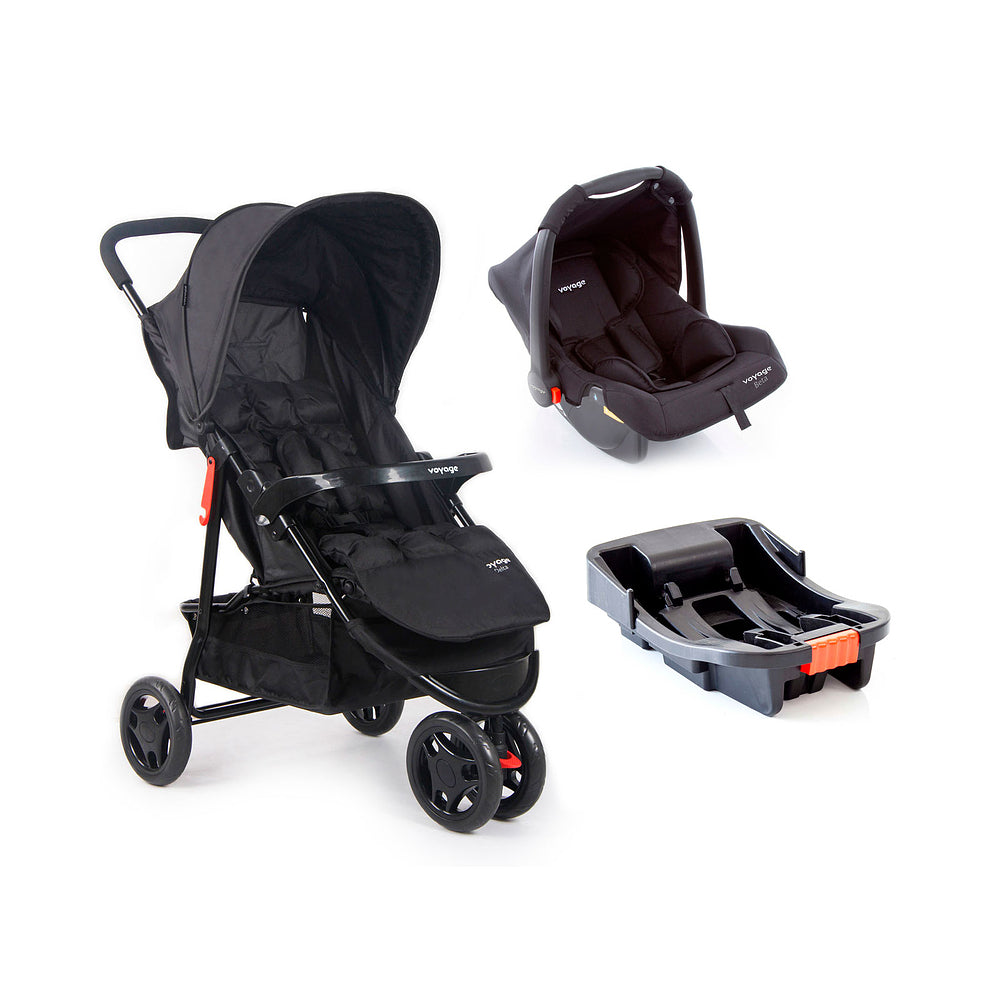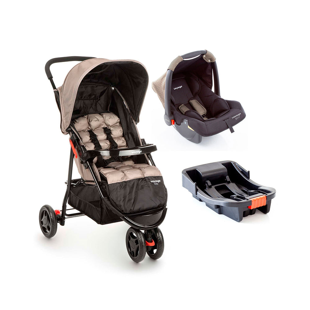 O Travel System Delta Trio Pro da Voyage é um conjunto composto pelo carrinho Delta e bebê conforto Beta com base veicular. O carrinho tem três rodas, moderno, com barra frontal removível e um confortável colchonete acolchoado, também removível e lavável. Possui cinto de segurança de 5 pontos, com altura e largura reguláveis. A inclinação do encosto pode ser ajustada em múltiplas posições desde a mais deitada até sentada: perfeito para os recém-nascidos, que também contam com a elevação do apoio de pés, para maior conforto, e perfeito para os maiorzinhos passearem observando tudo (com o apoio de pés abaixado).