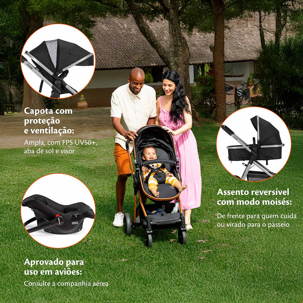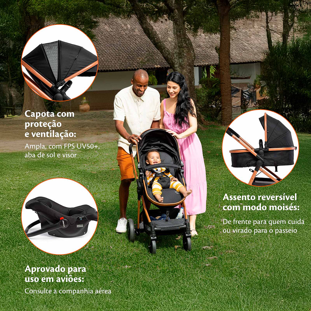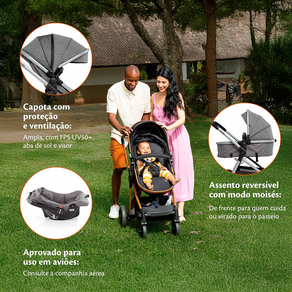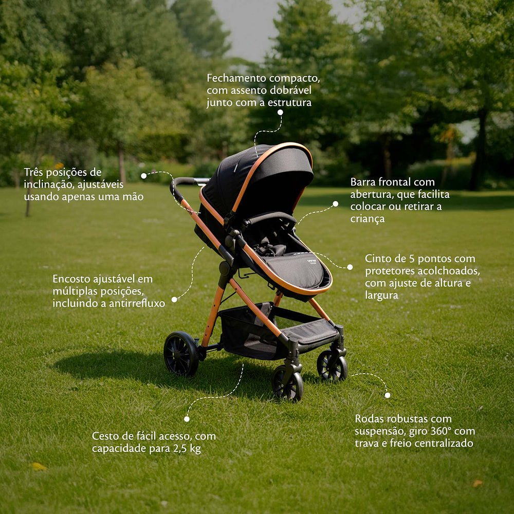 E para seu filho ficar confortável e protegido também em relação à temperatura, a capota conta com proteção UV50+, além de aba de sol e janela de ventilação com tela. O cesto do carrinho é amplo e de fácil acesso com capacidade para 2,5 kg, para você levar tudo o que possa precisar para atender as necessidades do bebê.