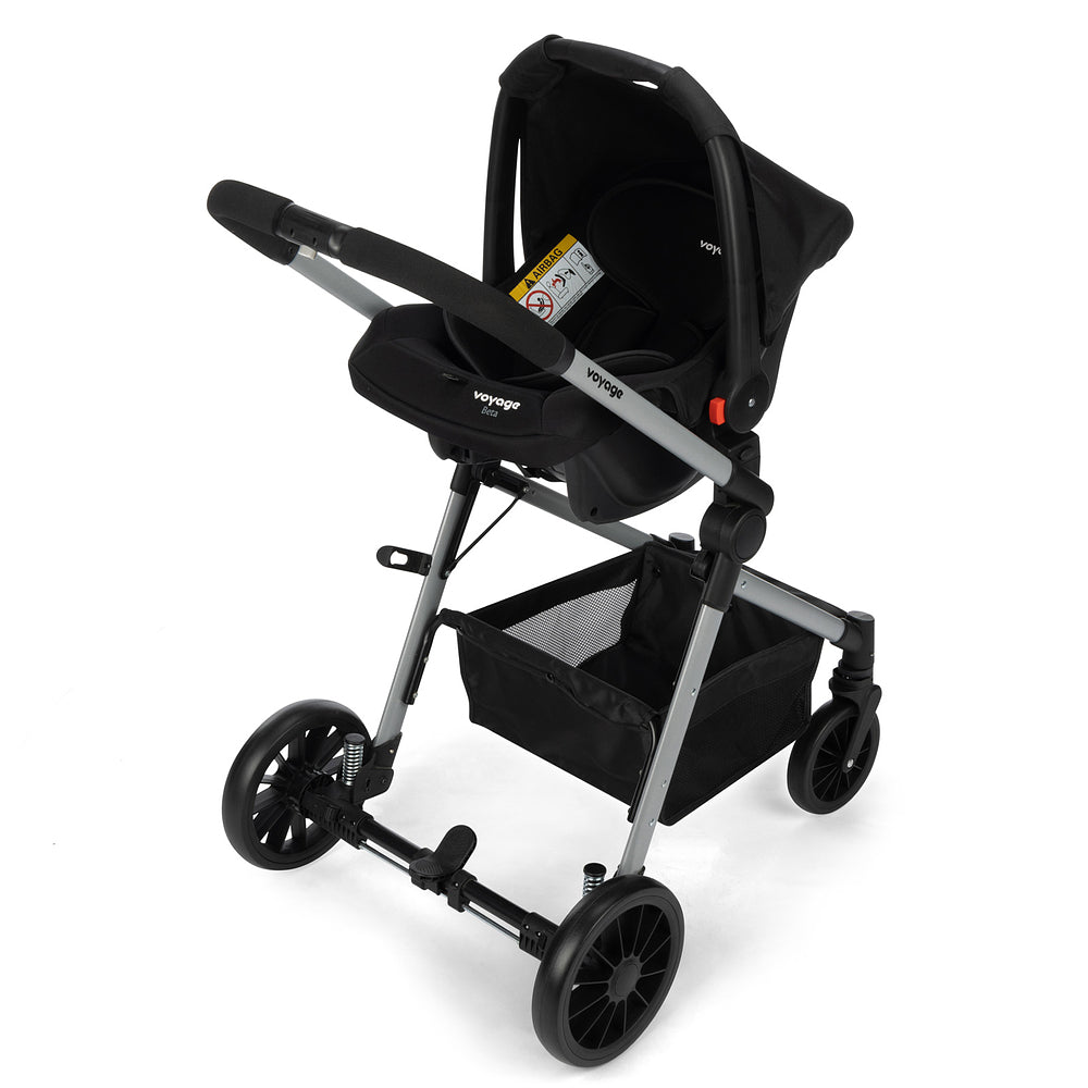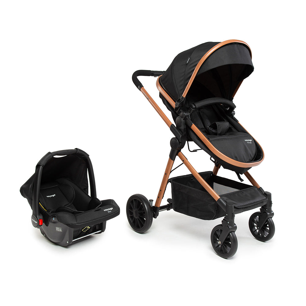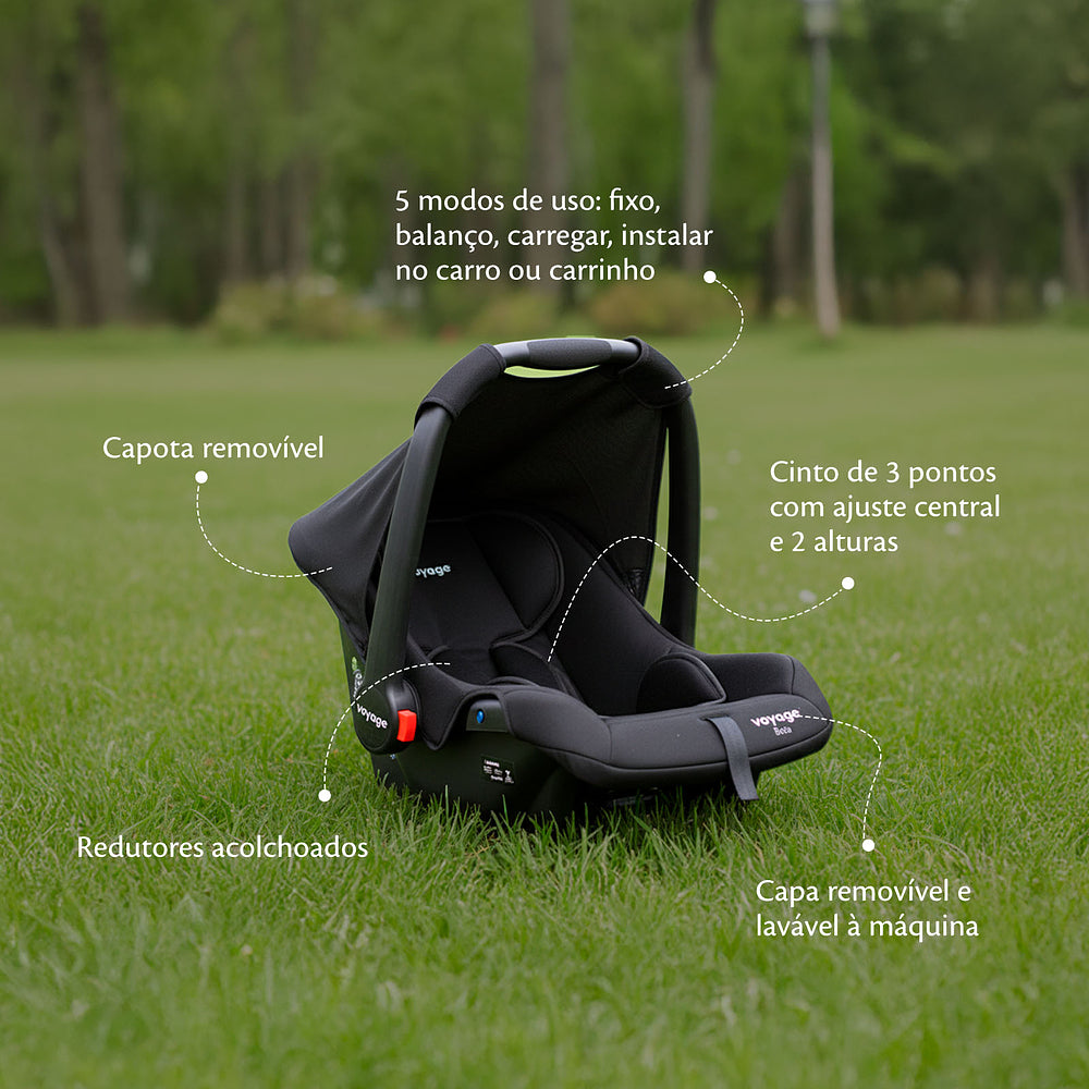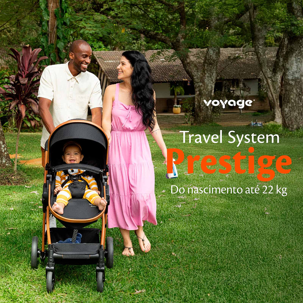 Compatível com bebê conforto, o Travel System Prestige acompanha o bebê conforto Beta Voyage e os adaptadores para acoplá-lo na estrutura do carrinho. O bebê conforto tem 5 modos de uso: fixo, balanço, transporte e instalação no carrinho e no automóvel. A almofada é acolchoada e a capota, removível. A capa pode ser lavada na máquina.